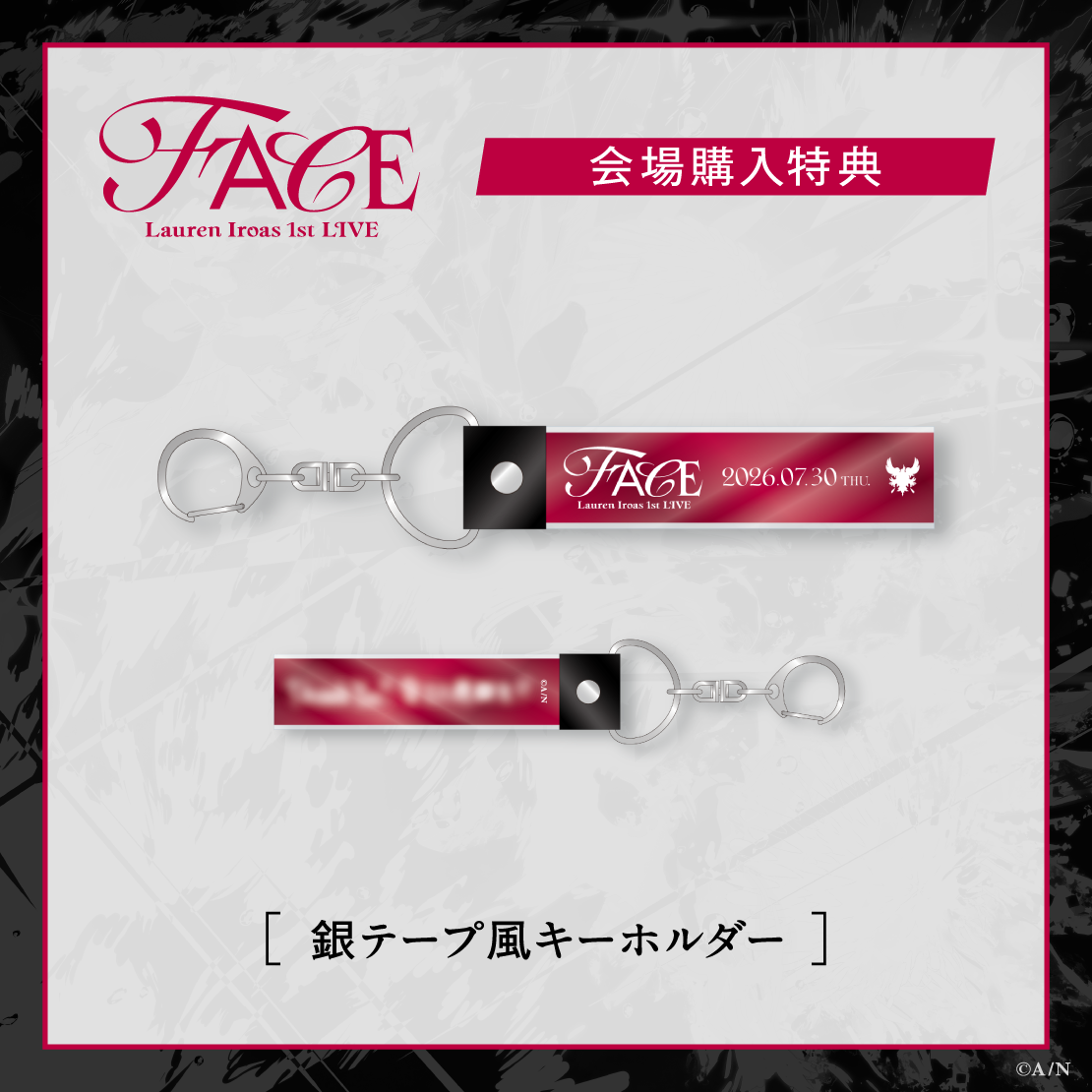 「ローレン・イロアス 1st LIVE “FACE”」会場内オフィシャルグッズ販売ブースで税込5,000円以上ご購入いただいたお客様に「銀テープ風キーホルダー(全1種)」を1点プレゼントいたします。