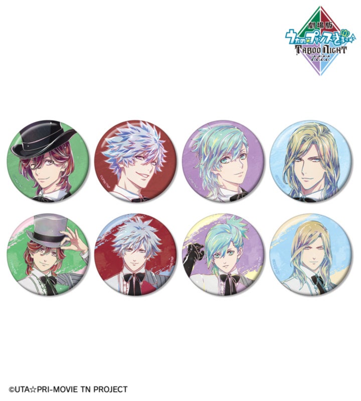寿 嶺二、黒崎蘭丸、美風 藍、カミュのビジュアルを新たなタッチで魅力的に表現し、缶バッジに仕上げました。