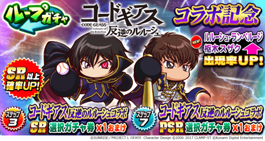 株式会社コナミデジタルエンタテインメントは、モバイルゲーム『実況パワフルプロ野球』(以下、『パワプロアプリ』)とアニメ『コードギアス 反逆のルルーシュ』とのコラボレーションを、本日4月23日(木)から開始したことをお知らせします。