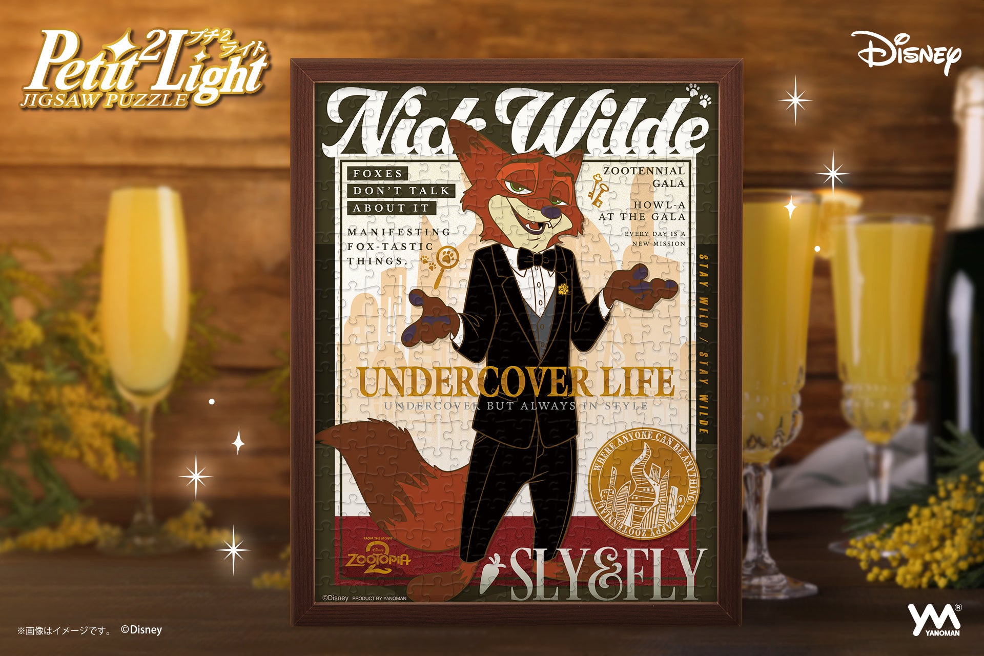 コールドフォイル印刷を使用したキラキラ輝くジグソーパズル。300ピースで組み立てやすく、完成後はプチ2専用インテリアスタンドフレーム(別売)を使ってそのまま飾れます。