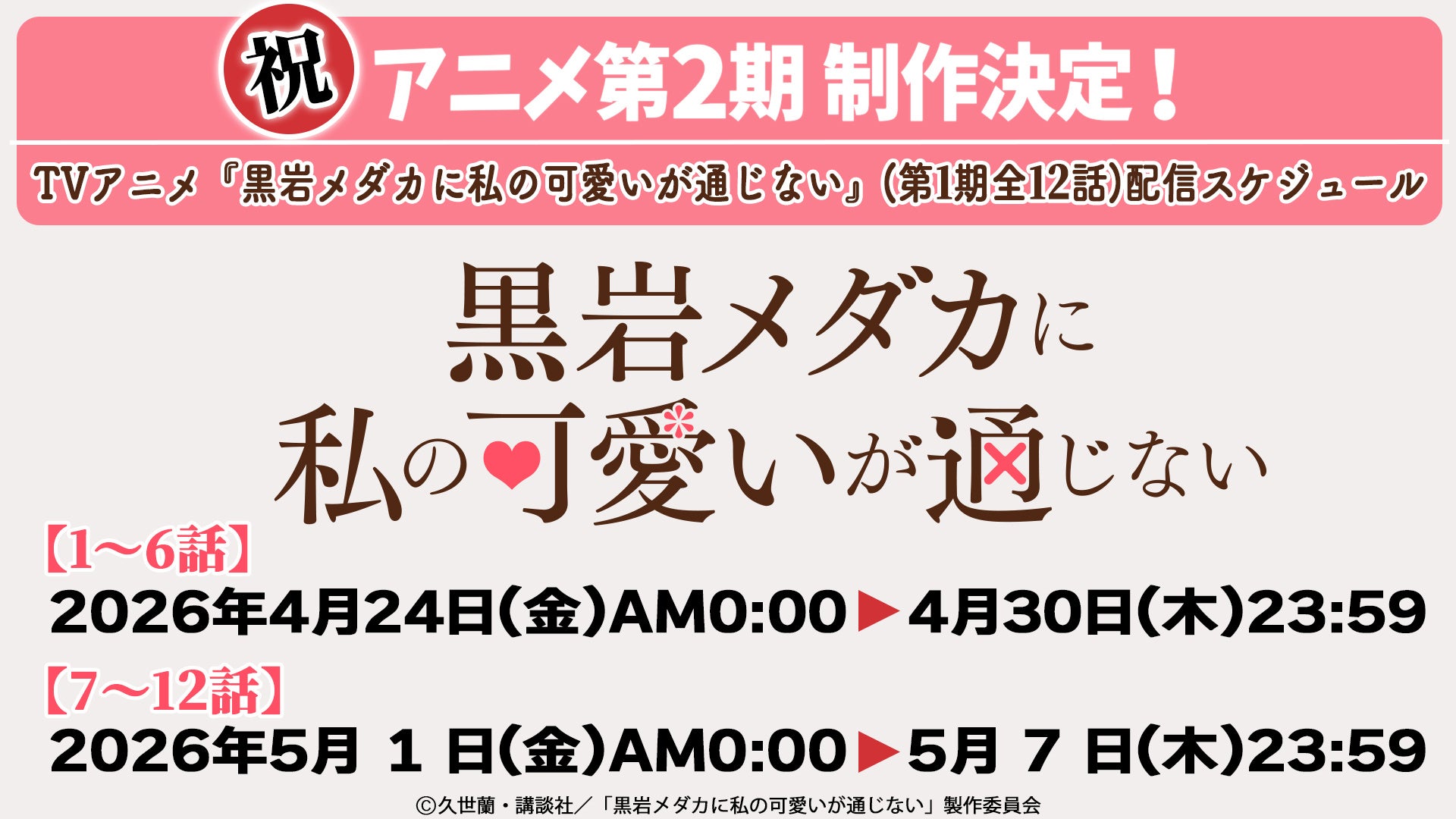 累計発行部数280万部突破!『週刊少年マガジン』(講談社)で好評連載中の人気マンガ『黒岩メダカに私の可愛いが通じない』を原作とする、TVアニメ『黒岩メダカに私の可愛いが通じない』の第2期制作が大決定!これを記念して、講談社が運営するYouTubeチャンネル「フル☆アニメTV」にて、TVアニメ『黒岩メダカに私の可愛いが通じない』第1期全12話を順次無料配信いたします。【第1話~第6話】を本日4月24日から4月30日まで、【第7話~第12話】を5月1日から5月7日までの期間限定配信となりますので、ぜひ原作コミックスと一緒にお楽しみください!