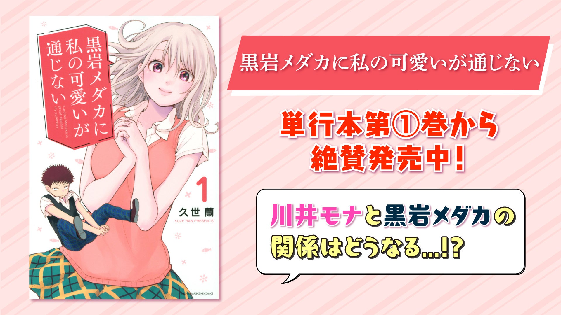 『黒岩メダカに私の可愛いが通じない』は、モテ女子×禁欲男子のラブコメディ!川井モナは、容姿端麗(!)スタイル抜群(!)息をするようにモテる女‼ しかし、そんな彼女に見向きもしない転校生・黒岩メダカの登場で、モナの学校生活は一変する。あの手この手でメダカをオトそうと大奮闘―――‼時にはちょっぴりカゲキなことも…!?大勃発する恋戦争、絶対にお見逃しなく。