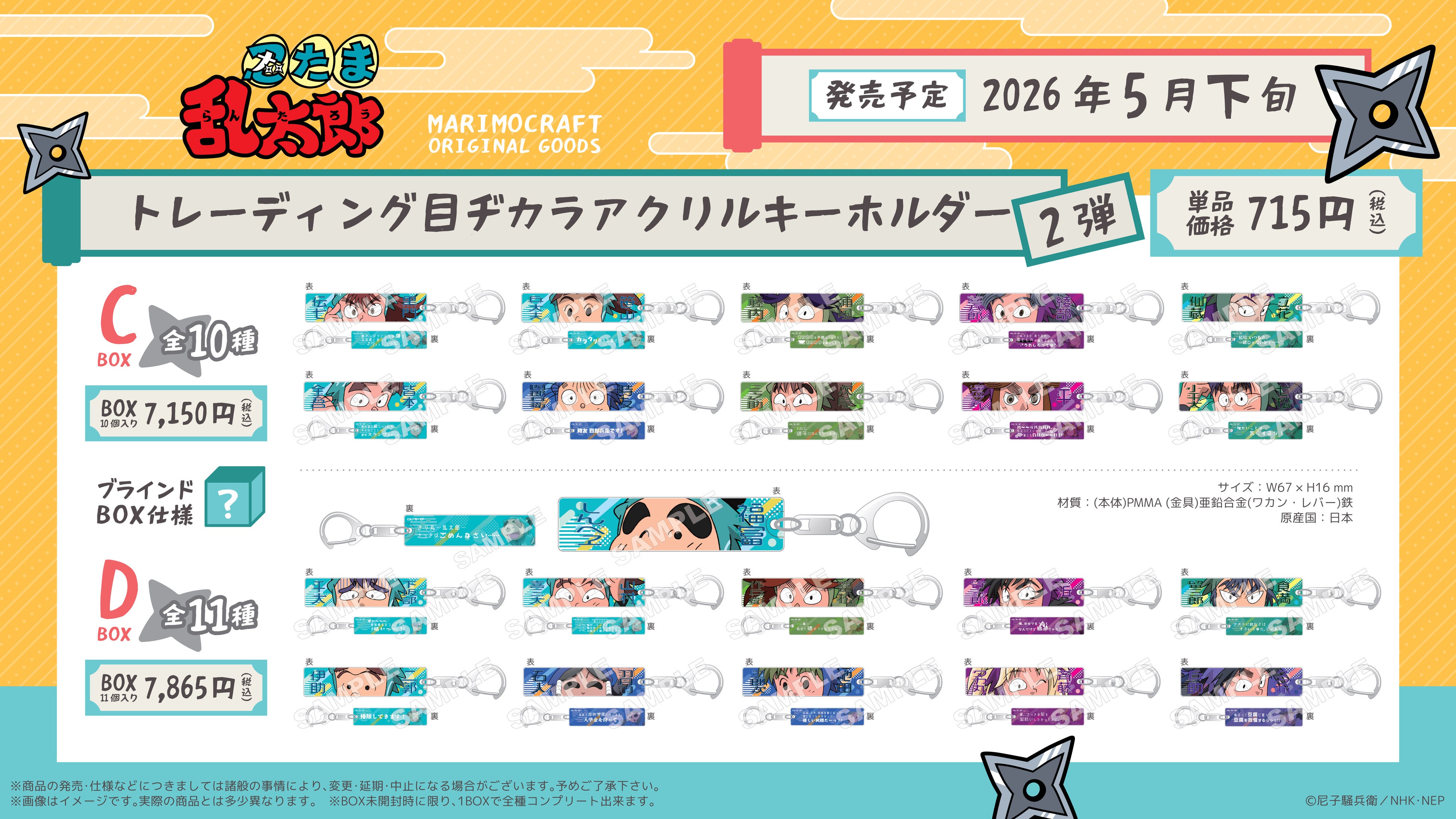『目ヂカラアクリルキーホルダー 第2弾』では、第1弾に続いて、CとDの2パターンのBOXを発売。CのBOXでは作法委員会&体育委員会のキャラクターを、DのBOXでは用具委員会&火薬委員会のキャラクターをラインナップしました。