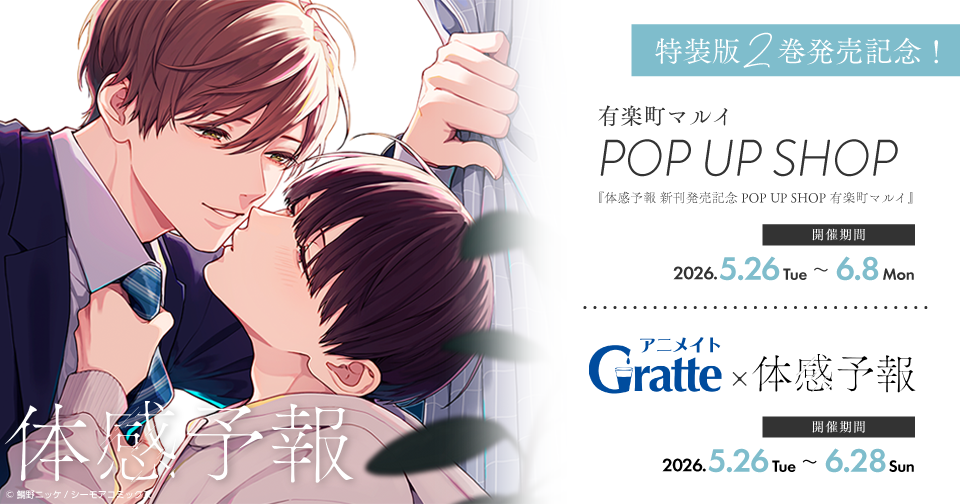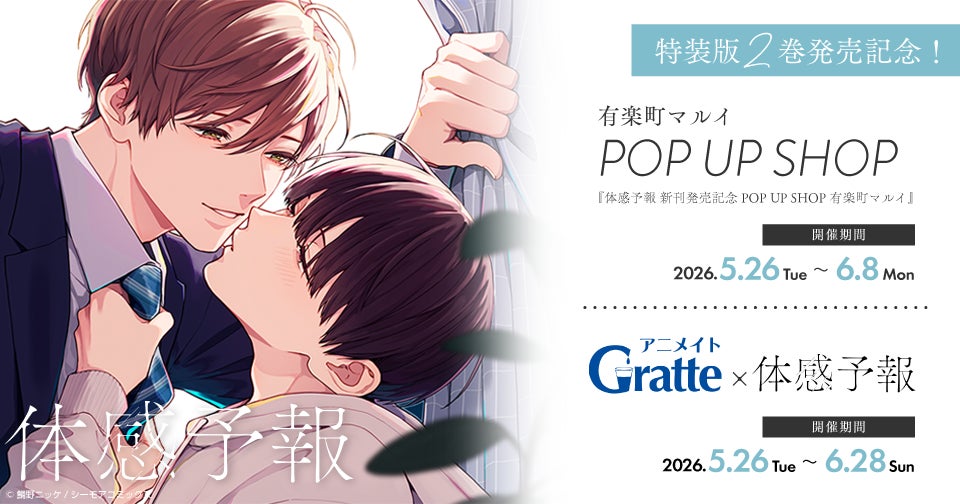 『体感予報』本編で、瀬ヶ崎と葉がデートを楽しんだ思い出の場所「有楽町マルイ」にて、期間限定POP UP SHOPを開催いたします。2人が過ごした空間で、描き下ろしイラストを使用した限定グッズを手に取る――ここでしか味わえない貴重な体験が待っています。作品の世界に入り込むような、特別なひとときを心ゆくまでお楽しみください。また、税込3,000円ご購入ごとに豪華景品が当たる抽選会も予定しております!