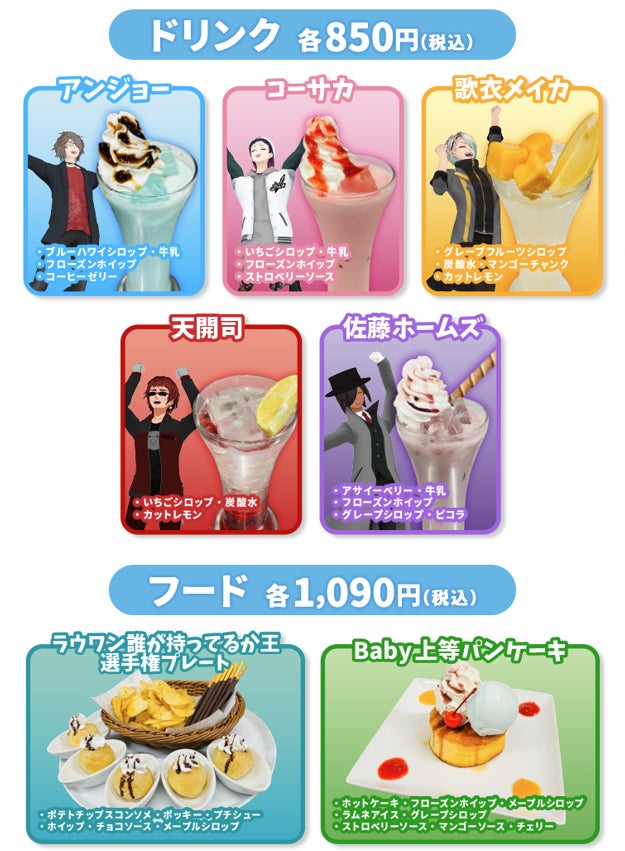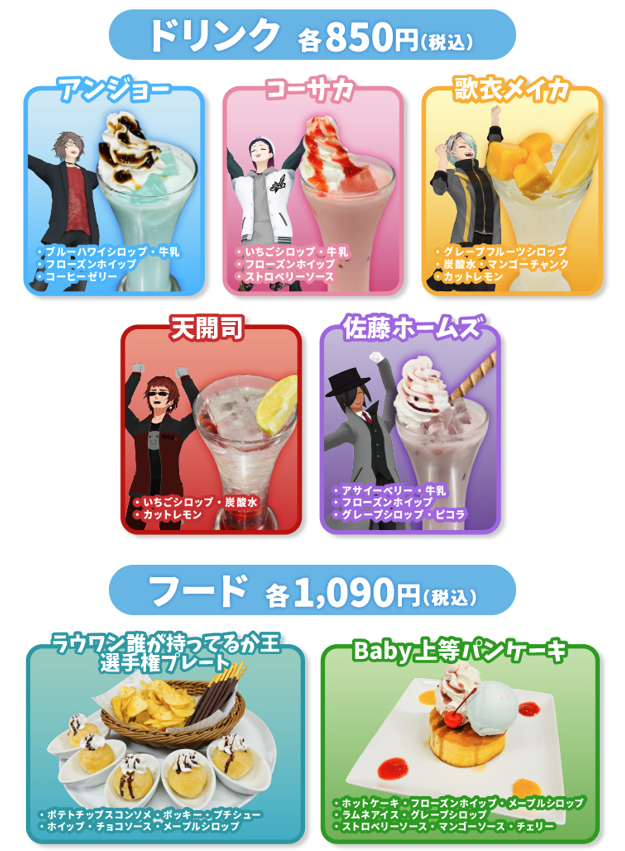 各VTuberをイメージしたドリンク(各850円・税込)や、人気企画「誰が持ってるか王選手権」にちなんだプレートなどのフード(各1,090円・税込)をお楽しみいただけます。コラボメニューご注文ごとに、ノベルティとしてトレーディングカードを1枚プレゼントいたします。