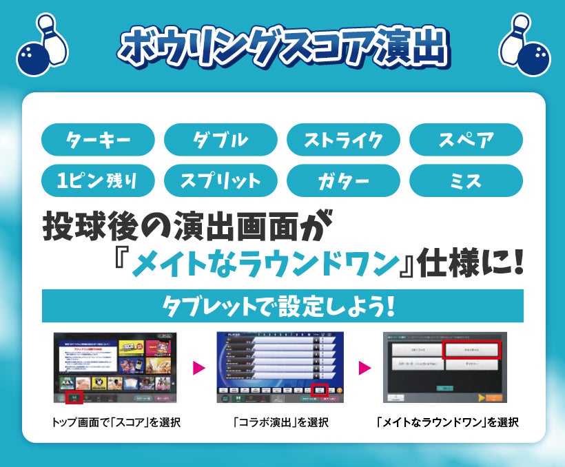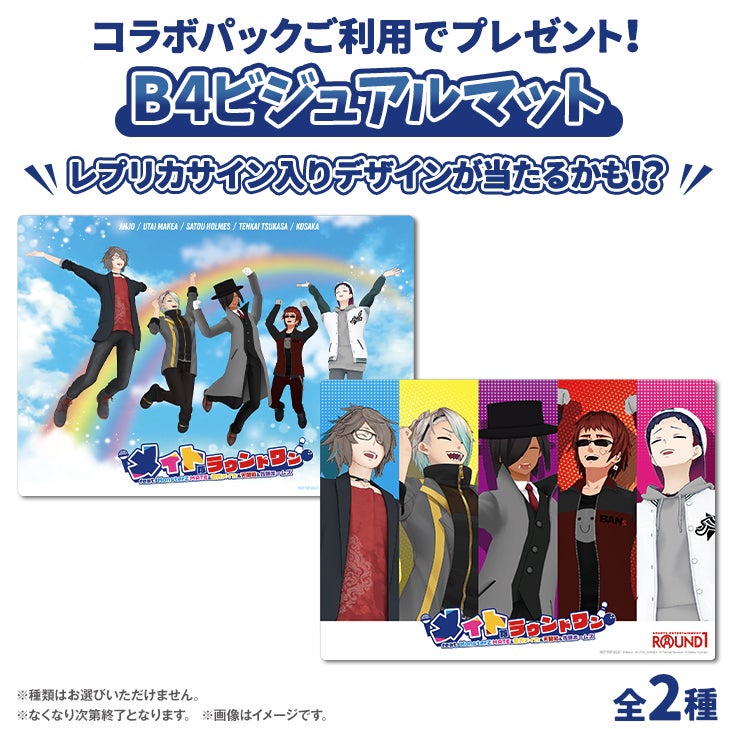 全国のラウンドワンのボウリング・カラオケ・ビリヤード・ダーツ・スポッチャにてコラボパックを販売いたします。コラボパックでご利用のお客さまにはオリジナルB4ビジュアルマット(全2種・ランダム)をプレゼントいたします。