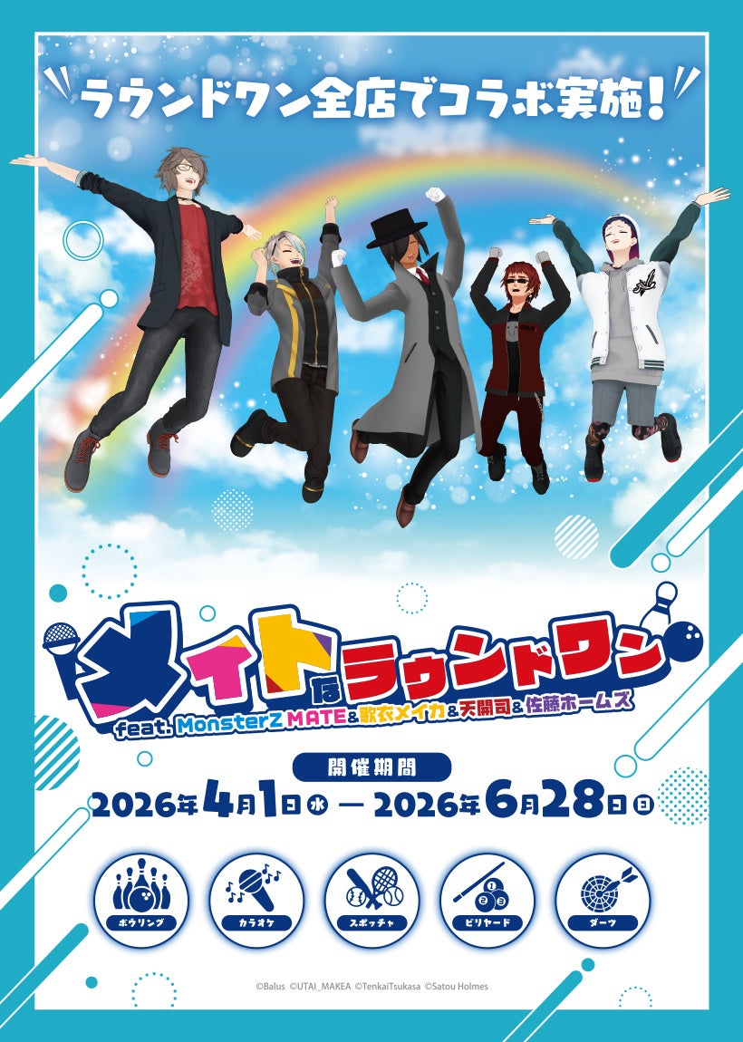 株式会社ハイ・シーズン(本社:東京都千代田区/代表取締役:伊藤敦司)は、2026年4月1日(水)よりラウンドワン全店にて開催中の『メイトなラウンドワン feat.MonsterZ MATE&歌衣メイカ&天開司&佐藤ホームズ(以下、本コラボ)』について、コラボ動画の公開、および新グッズの追加販売を開始いたしましたのでお知らせいたします。