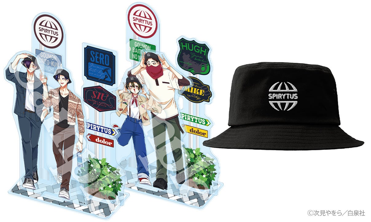 次見やをら先生描き下ろしイラストを使用したミケ&ヒューver.のアクリルスタンド。お揃いでかぶっているスピリタス社バケットハットを自慢するミケとヒューが仲良く歩く様子を立体的に表現しています。スピリタス社のロゴや名前が書かれた標識が付属。コミックス最新第8巻とセットでお届けします。