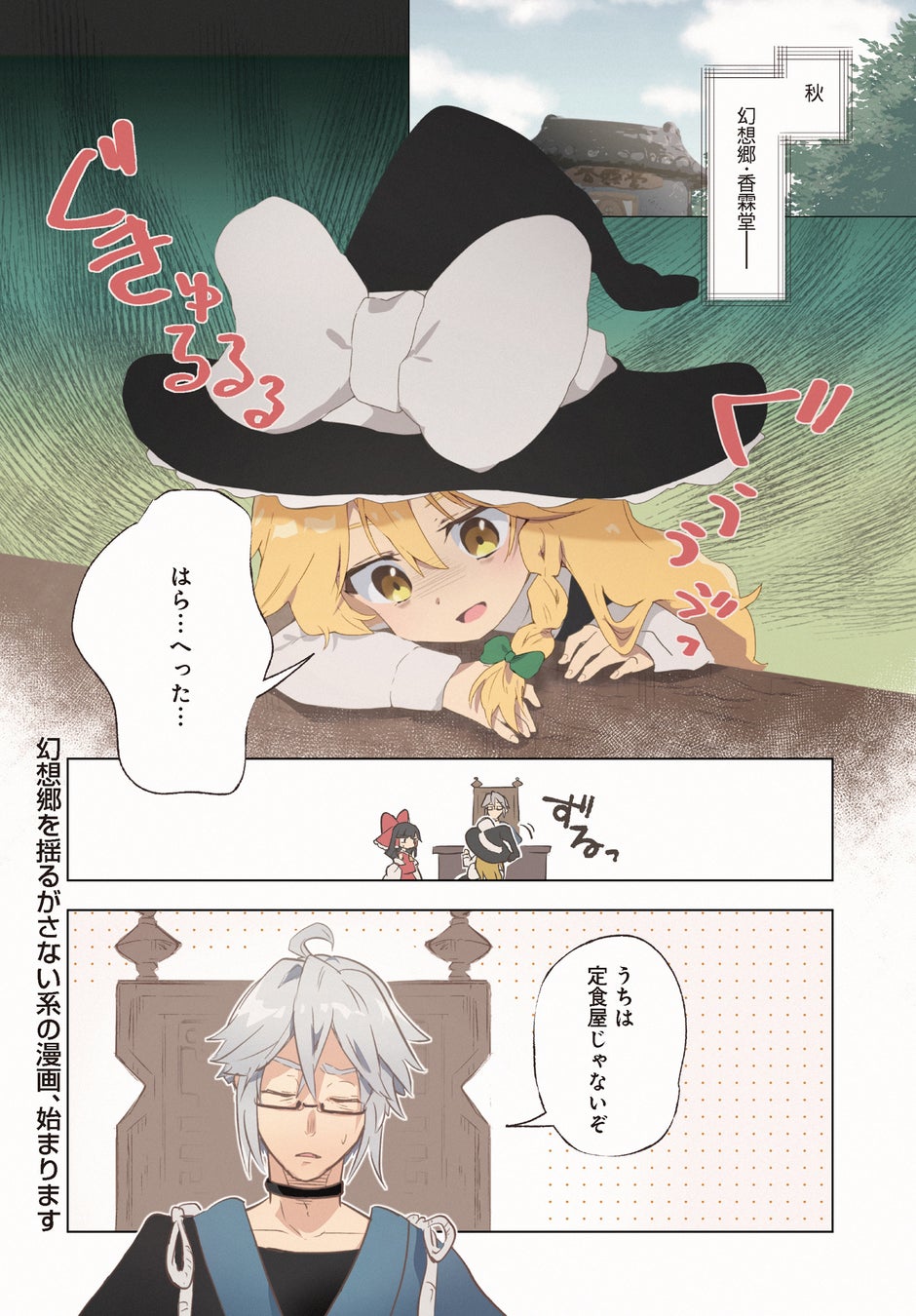 東方ごはんコミック♪魔法の実験に失敗してしまい、備蓄の食糧を吹き飛ばしてしまった魔理沙。