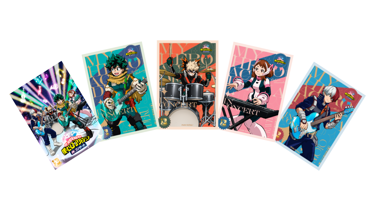 描き下ろしビジュアルを使用したアートボード特典付きチケットを購入頂いた方は1枚につき、キービジュアル(KV)ver.、緑谷出久ver.、爆豪勝己ver.、麗日お茶子ver.、轟焦凍ver.の5種類から1種類お選び頂けます。