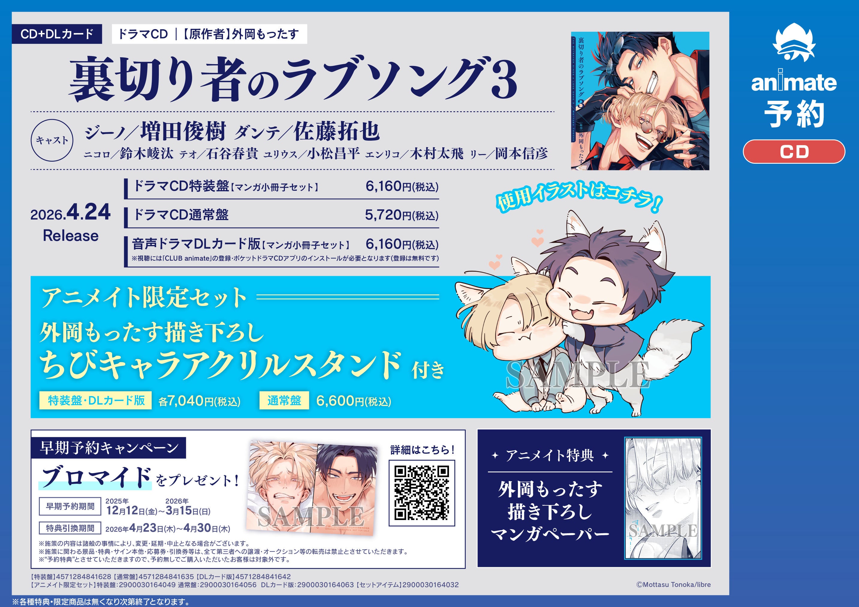 株式会社リブレ(本社:東京都新宿区、代表取締役社長:是枝由美子)は、ドラマCD「裏切り者のラブソング3」を2026年4月24日に発売致しました。https://www.b-boy.jp/special/uralove/cd/