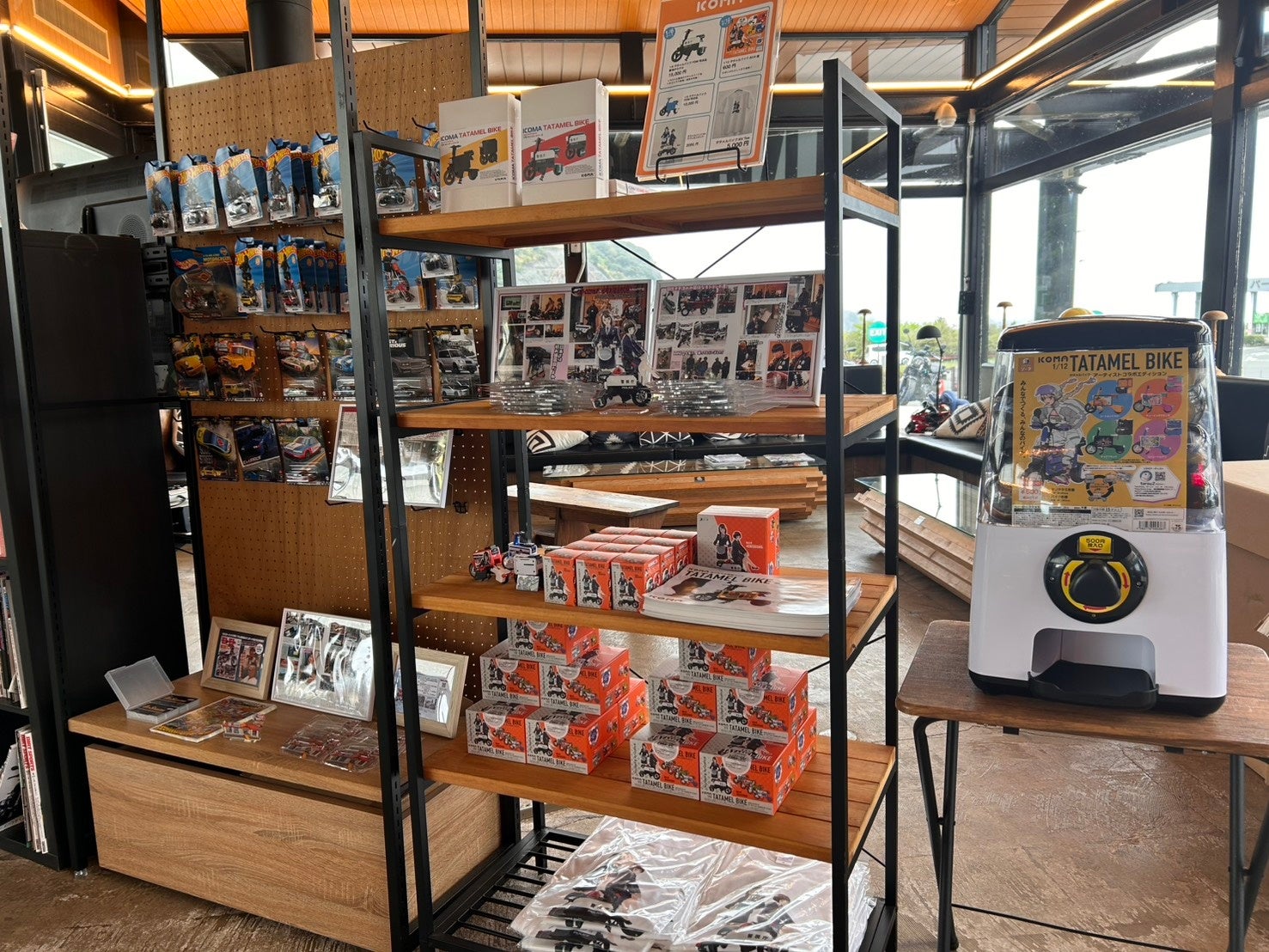 TATAMEL BIKEのカプセルトイ、藤島先生コラボ関連グッズ、太田商店のモトコンポミニカーやバイク、クルマ系ミニカーなど持ち帰り可能な楽しいゾーンです。
