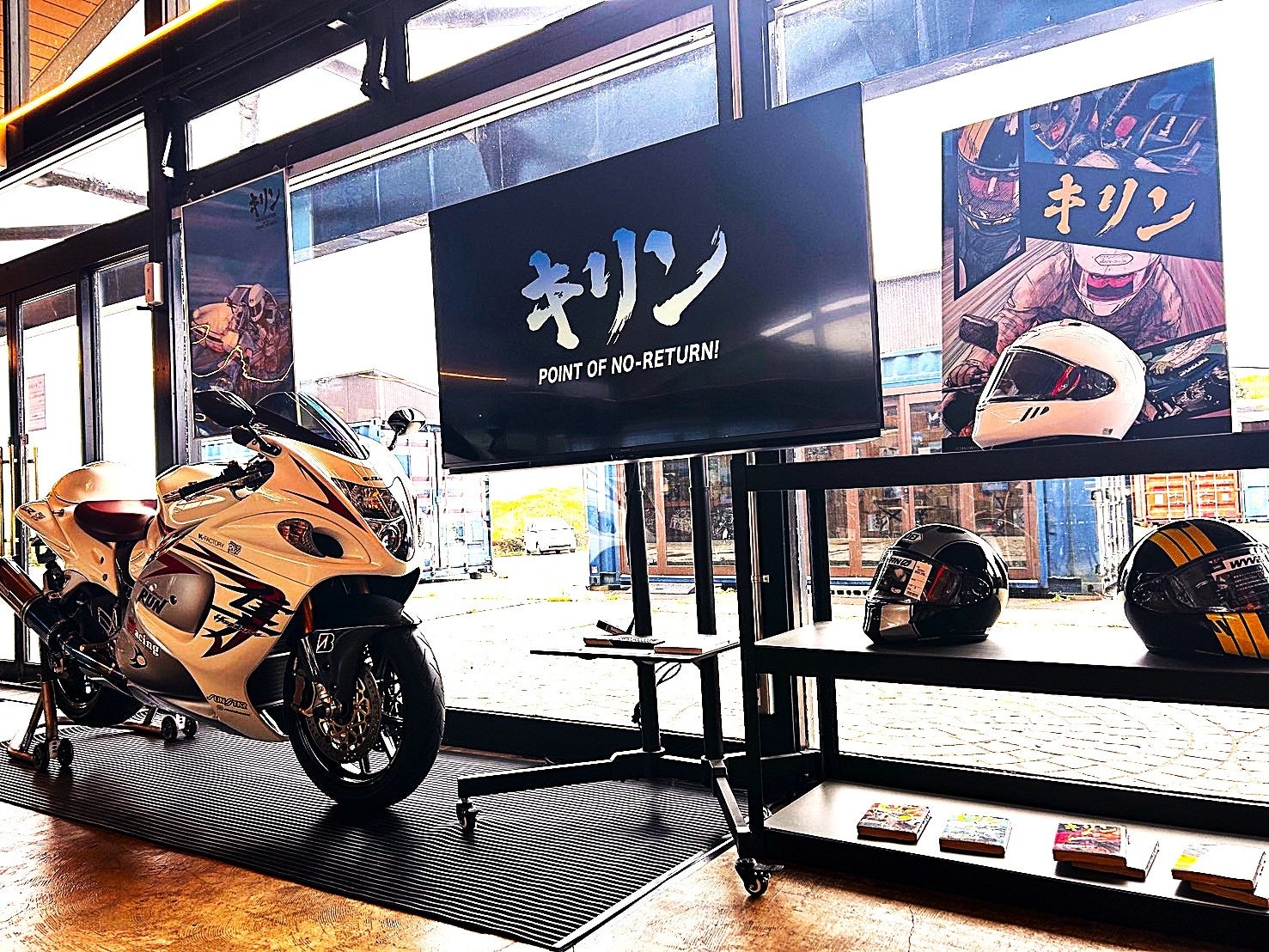 劇中使用車HAYABUSAレプリカ及びSHOEIコラボヘルメットの展示