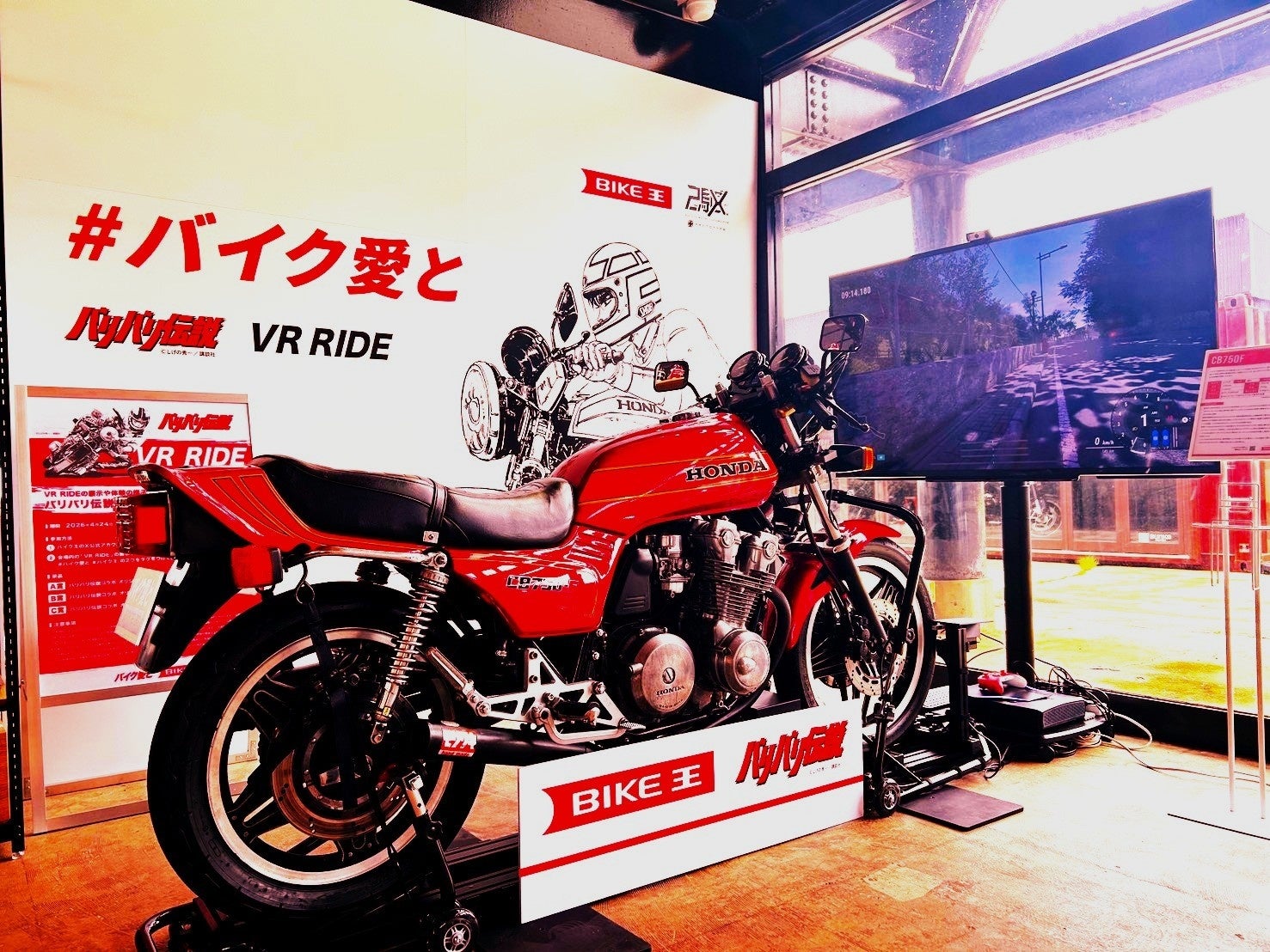 劇中から抜け出てきたように再現された主人公の愛車「CB750F」 に実際に跨り、プロトタイプ社が開発する 実車センシング型VRシミュレーター「2X Freedom」 と、二輪レースゲーム(RIDE5)を連結し、まるで作品の中に入り込んだかのような没入体験を提供します。