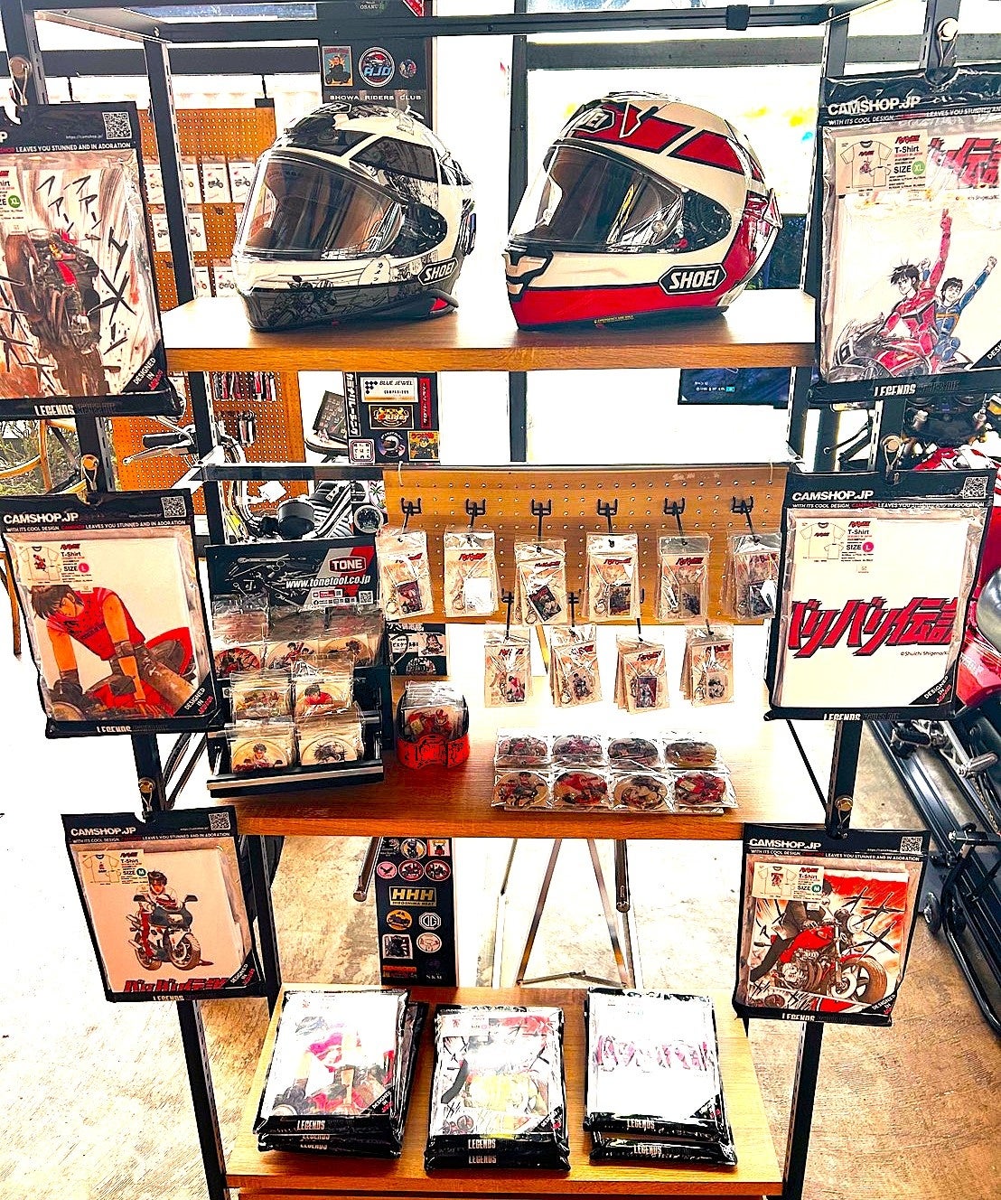 SHOEIが過去販売していたコラボヘルメット展示及び関連グッズの販売