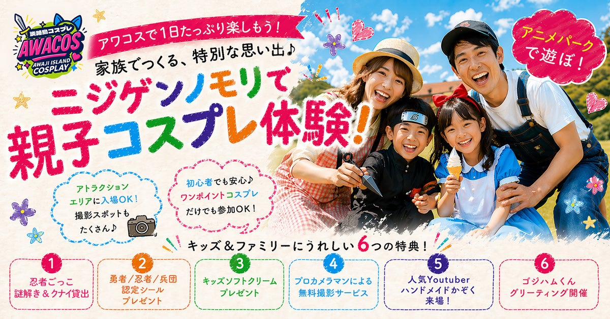 本プログラムは、子どもたちがコスプレを通じてアニメやゲームの世界観に没入し、家族で特別な思い出を作れるよう企画されました。コスプレ体験やアワコス認定証(シール)の配布、プロカメラマンによる無料撮影など、多彩なコンテンツをご用意しています。
