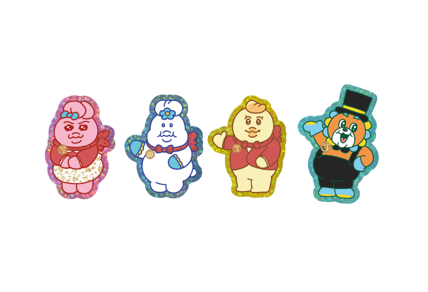 デパートで働くキャラクターたちのホログラムステッカー。きらめくデザインと、デパート仕様の衣装をまとったキャラクターを楽しめるアイテムです。