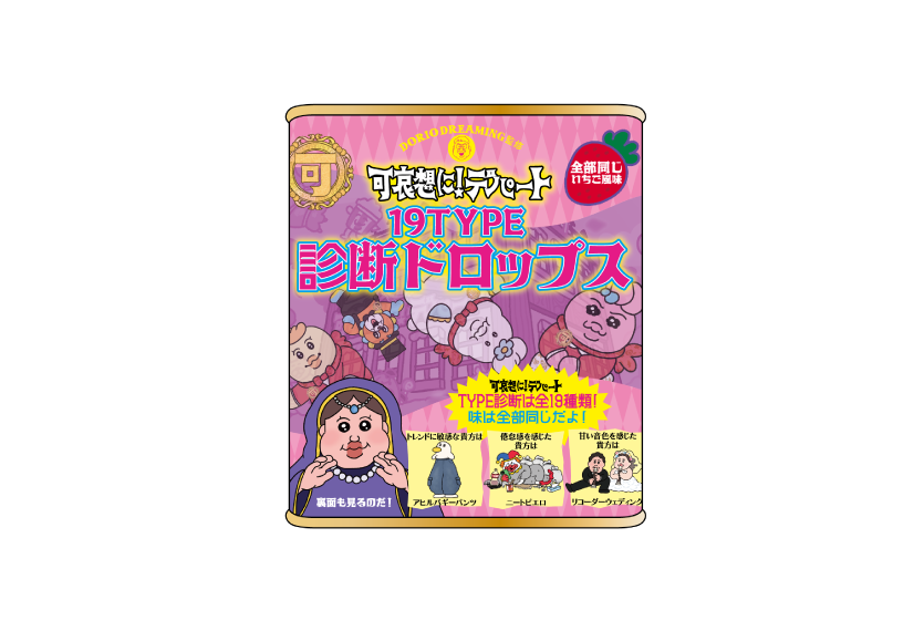可哀想に!デパート「19TYPE診断」をモチーフにしたドロップス缶。味はすべて同じいちご風味です。