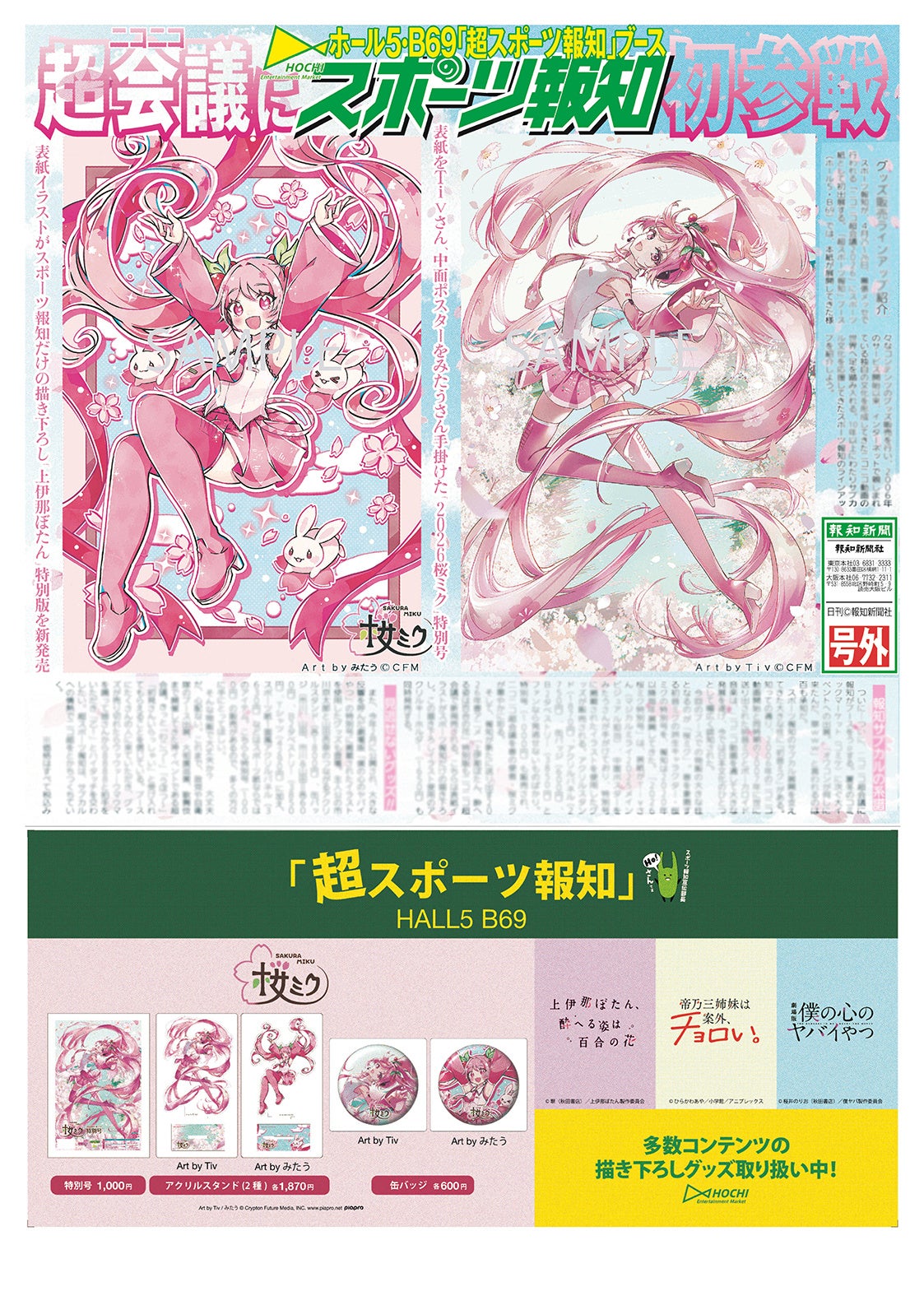 スポーツ報知を発行する報知新聞社は4月25、26日に幕張メッセで開催される「ニコニコ超会議2026」に初出展することになりました。会場では当日新発売の「2026年 桜ミク特別号」や桜ミクの描き下ろしイラストグッズを販売。同日新発売の「上伊那ぼたん、酔へる姿は百合の花」特別版や描き下ろしイラストグッズもお披露目。「初音ミク」や「僕の心のヤバイやつ」グッズも取りそろえます。