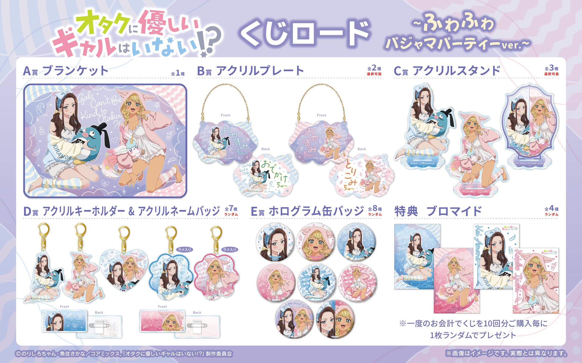 株式会社ブシロード(本社:東京都中野区、代表取締役社長:木谷高明)のグループ会社にあたる株式会社ブシロードクリエイティブ(本社:東京都中野区、代表取締役社⻑:成⽥耕祐)は、2026年4月24日(金)よりハズレなしのオンラインくじ「くじロードONLINE」より『アニメ「オタクに優しいギャルはいない!?」 くじロード ~ふわふわパジャマパーティーver.~』が販売したことをお知らせいたします。