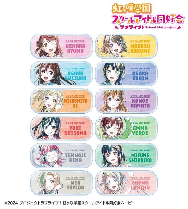 上原歩夢、中須かすみ、桜坂しずく、朝香果林、宮下 愛、近江彼方、優木せつ菜、エマ・ヴェルデ、天王寺璃奈、三船栞子、ミア・テイラー、鐘 嵐珠の描き下ろしイラストを新たなタッチで魅力的に表現し、星型の缶バッジに仕上げました。