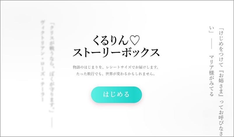概要:今年で創刊50周年を迎える「集英社コバルト文庫」の記念企画展に設置します。画面上で「伝説的ヒット作品」「圧倒的キュンキュン」など5つのカテゴリから一つ選択すると、コバルト文庫の100作品からランダムで、作品の冒頭を無料で読むことができます。展示タイトルの「くるりん♡ストーリーボックス」は、過去にコバルト文庫で実施され人気を博した読者向けサービス「くるりん♡ファックス」にちなんでいます。