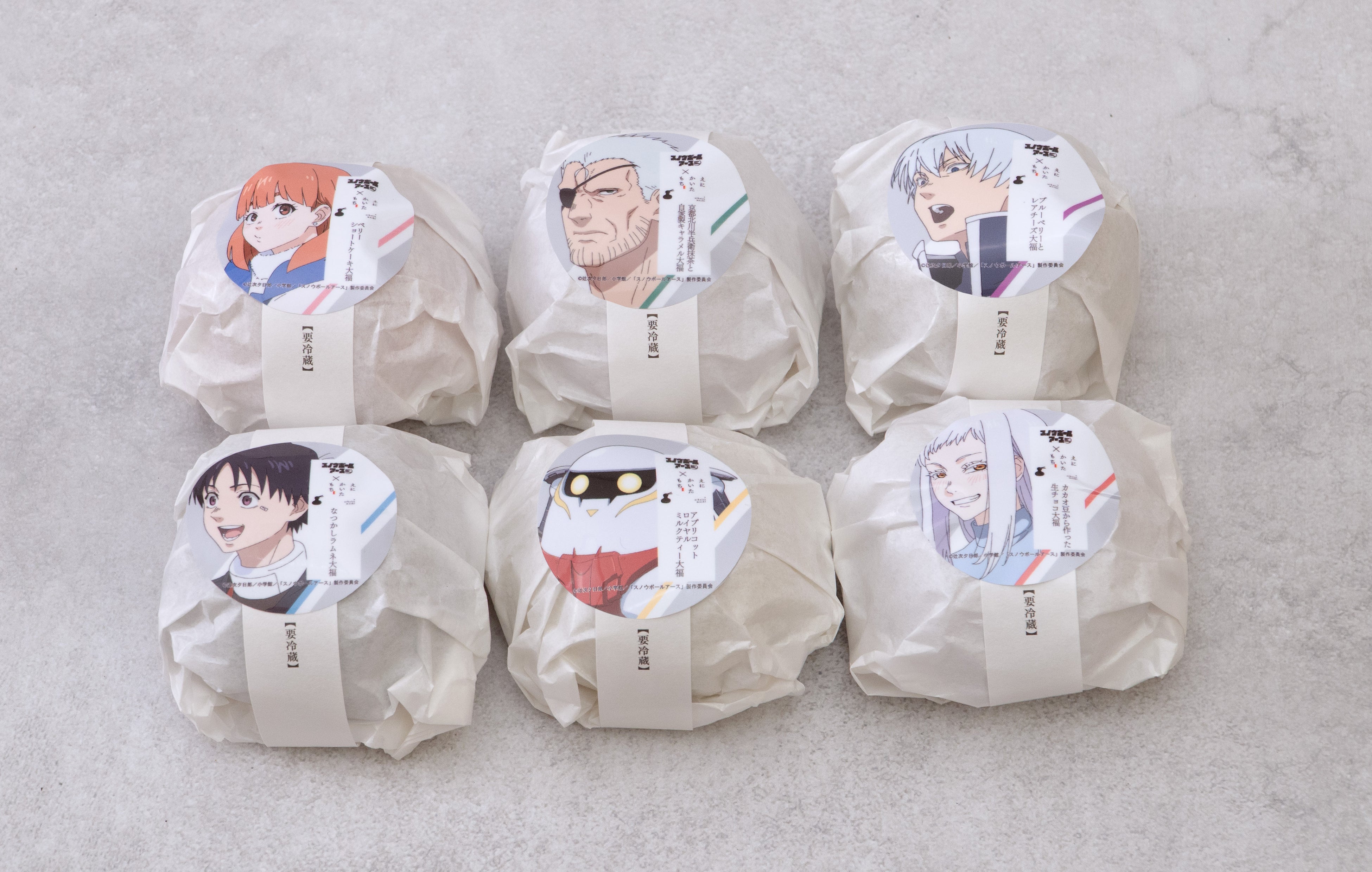 商品詳細:TVアニメ「スノウボールアース」をイメージした丸い大福を特別にご用意いたしました。なつかしラムネ大福、アプリコットロイヤルミルクティー大福、カカオ豆から作った生チョコ大福、ベリーショートケーキ大福、ブルーベリーとレアチーズ大福、京都北川半兵衛抹茶と自家製キャラメル大福の6種をご用意しております。