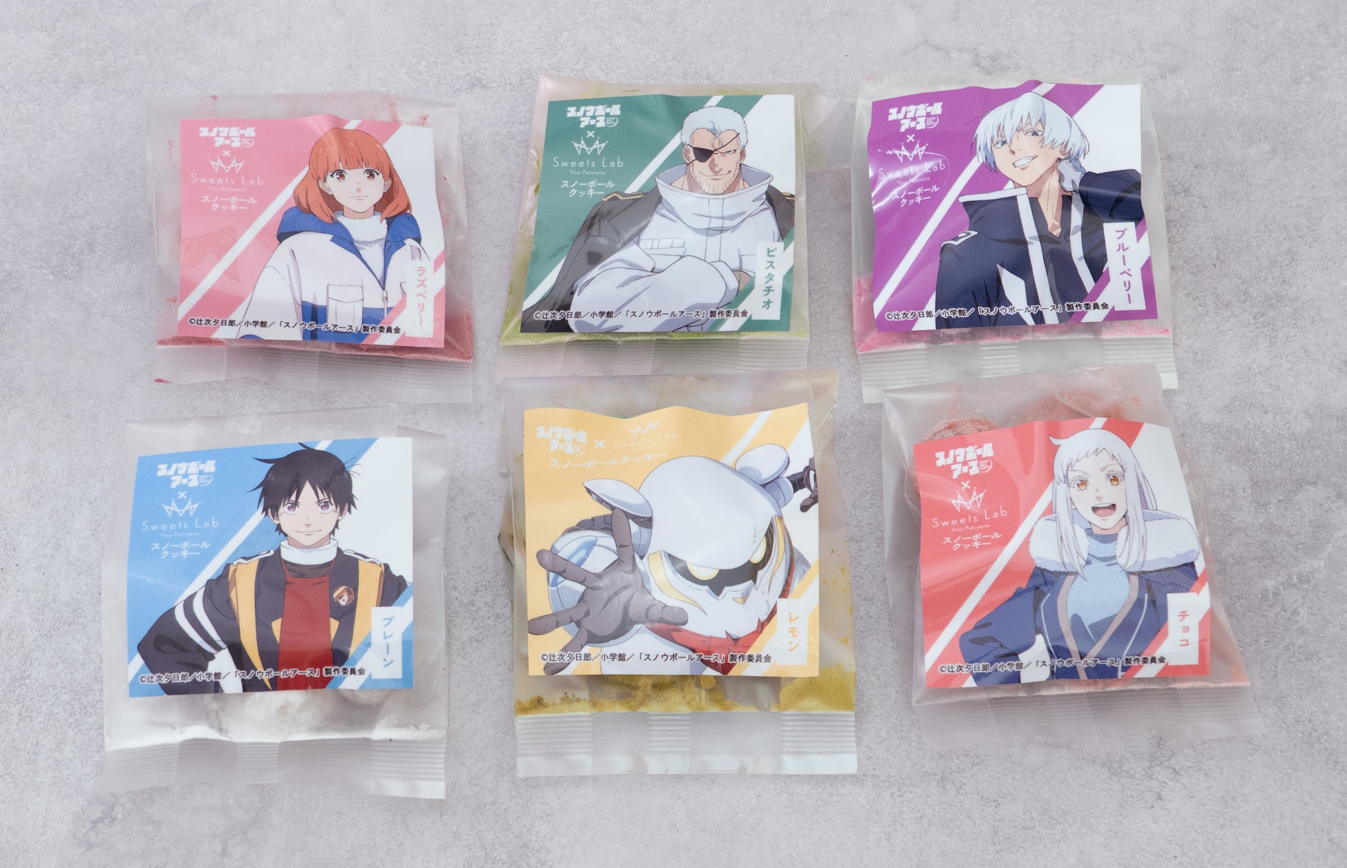 商品詳細:TVアニメ「スノウボールアース」からイメージしたスイーツ、スノーボールを特別にご用意いたしました。プレーン、レモン、チョコ、ラズベリー、ブルーベリー、ピスタチオの6種をご用意しております。