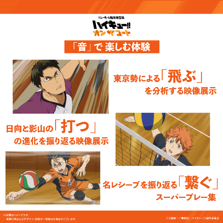 本イベントでは、「飛ぶ」「打つ」「繋ぐ」の3つのエリアにて、キャラクターがプレーを振り返る映像展示を実施します。目の前で展開される作中のプレーにあわせて、キャラクター同士の掛け合いや解説が楽しめます。バレーボーラー視点でプレーを深く掘り下げ、アニメ本編では語られない内容にも踏み込んだ構成となっています。