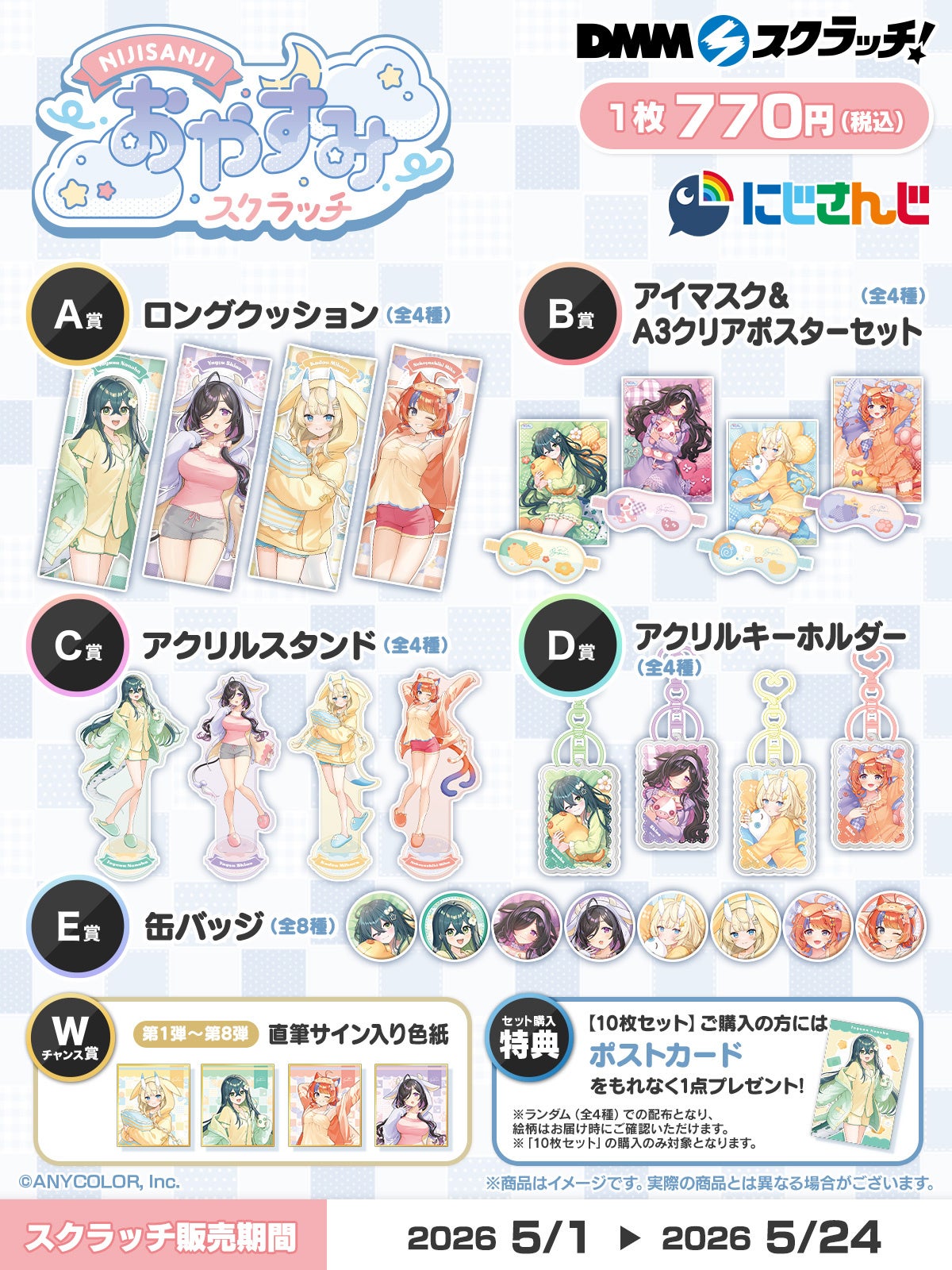 合同会社DMM.com(本社:東京都港区、PFカンパニーCEO:村中悠介、以下DMM)は、ハズレなしのオンラインくじサービス「DMMスクラッチ」にて、2026年5月1日(金)より『にじさんじ「おやすみ」 スクラッチ』を販売することをお知らせいたします。本くじでは、DMMスクラッチ限定の多彩なラインナップと共に、ライバーの直筆サイン入り色紙が抽せんで当たるWチャンス賞を計24日間開催いたします。