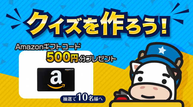 本機能のリリースを記念し、3月5日(木)~3月18日(水)の期間で「クイズを作ろう!キャンペーン」を開始いたします。期間中にクイズを作成したユーザーの中から抽選で10名様に、Amazonギフトコード500円をプレゼントいたします。