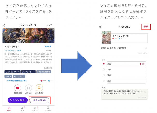 好きな作品のク4択クイズを作成し、アプリ内でシェアすることができます。また、同じ漫画好きが投稿したクイズを回答することもできます。
